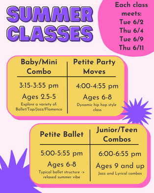 Each class listed below meets twice a week for 2 weeks. The price listed is total for all 4 classes.